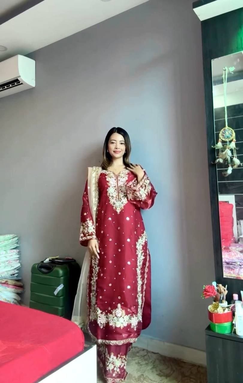 Designer Pure Romansilk Chanderi Anarkali with Dupatta & Pant Set